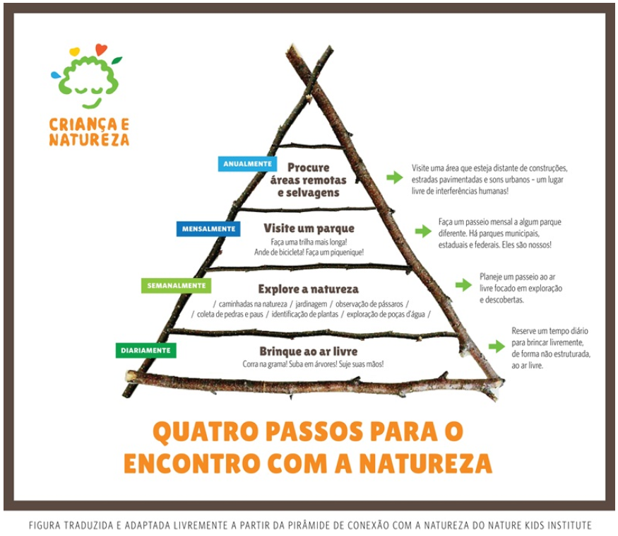 Na base da pirâmide, está uma atividade para ser feita diariamente : brincar ao ar livre. Na sequência, uma para ser feita semanalmente : explorar a natureza. Depois, um passeio mensal : visitar um parque. No topo, algo que pode ser feito anualmente : procurar áreas remotas livres de grandes interferências humanas.