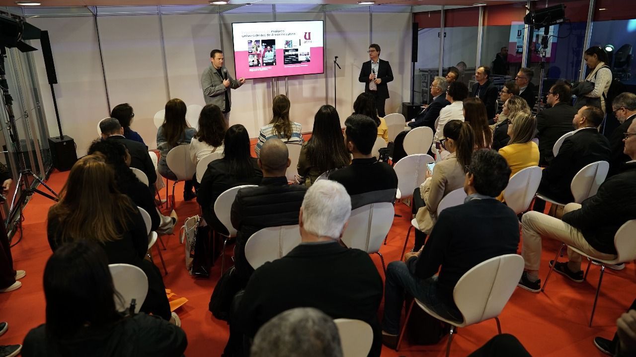 No estande da Plataforma A, os diretores Stephan Younes, Rodrigo Severo e Vinicius Dias, além do CEO da +A Educação Luiz Trivelato, apresentaram a novidade em um espaço interativo.
