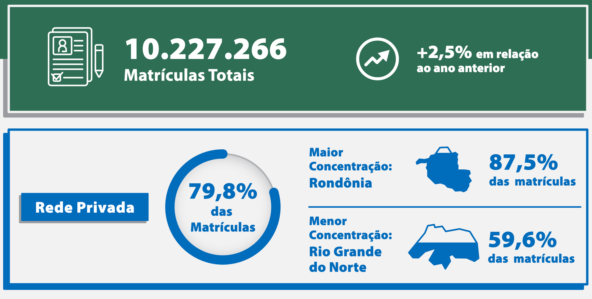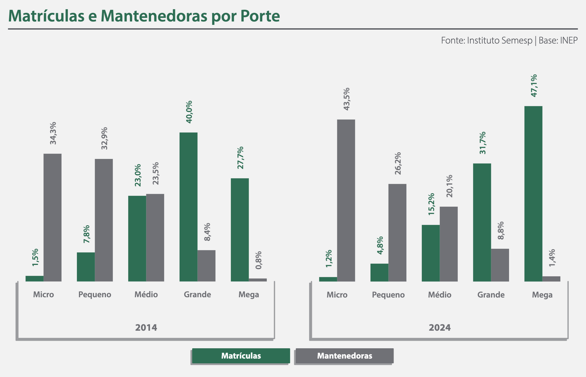 Ao mesmo tempo, cresce a concentração no setor. Um grupo restrito de mantenedoras — 1,4% do total — reúne 47,1% dos estudantes, indicando redução da diversidade institucional. Na rede privada, a disparidade é ainda maior: 1,2% das IES detêm 55,1% do total de matrículas.
