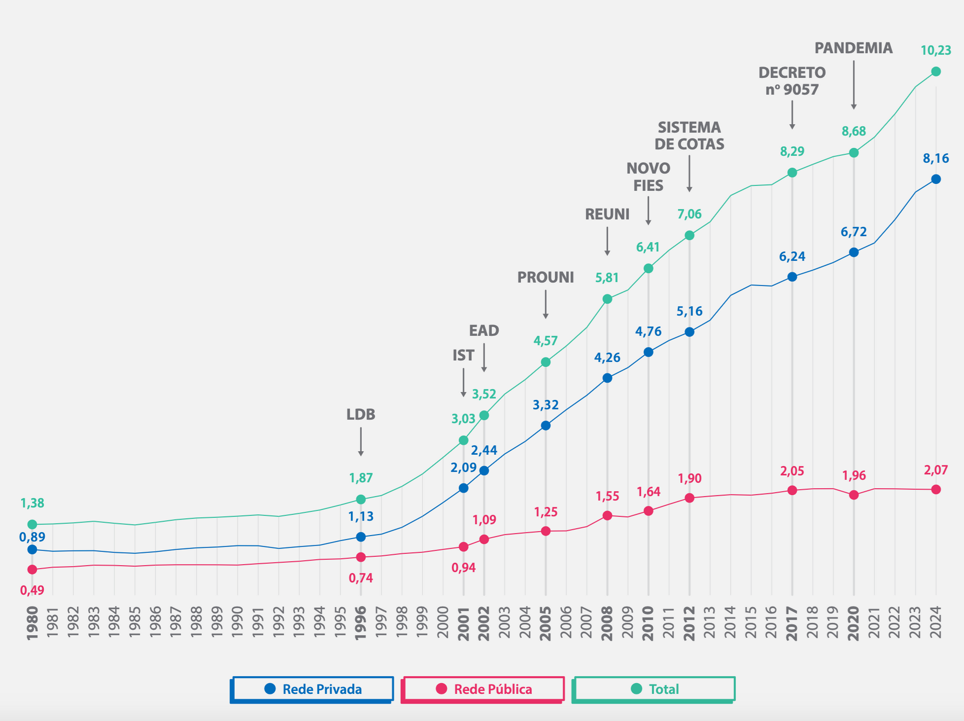Entre 2023 e 2024, o número de ingressantes aumentou 1% na rede privada e 2,6% na pública. Ainda assim, o ganho foi mais moderado do que em ciclos anteriores. Houve queda de 5,9 pontos percentuais em relação ao período anterior, que também havia sofrido decréscimo em relação a 2022.