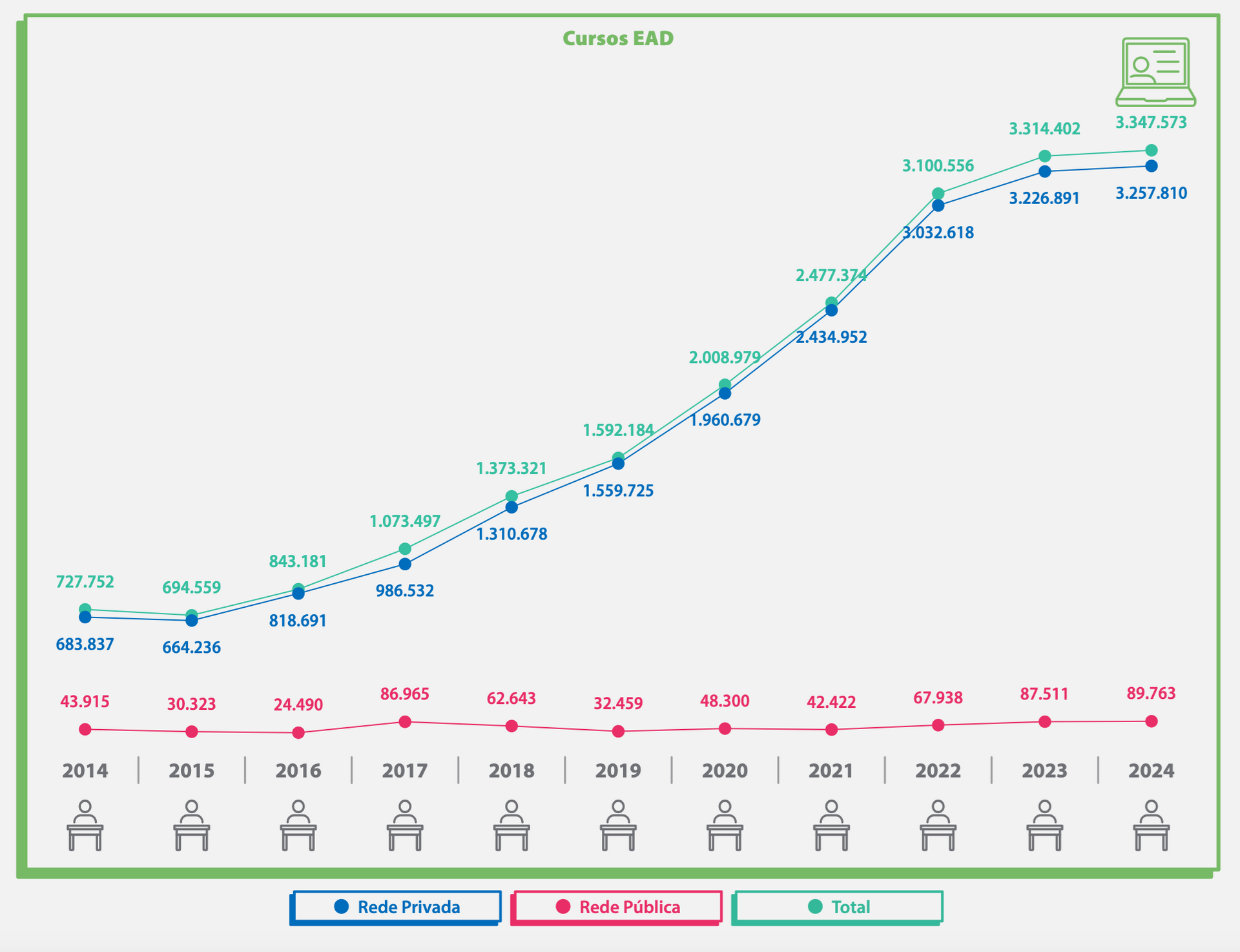 Nos cursos EaD, o aumento de ingressantes chegou a 360% entre 2014 e 2024. Hoje, 97,3% dos novos alunos da modalidade estudam em IES privadas.