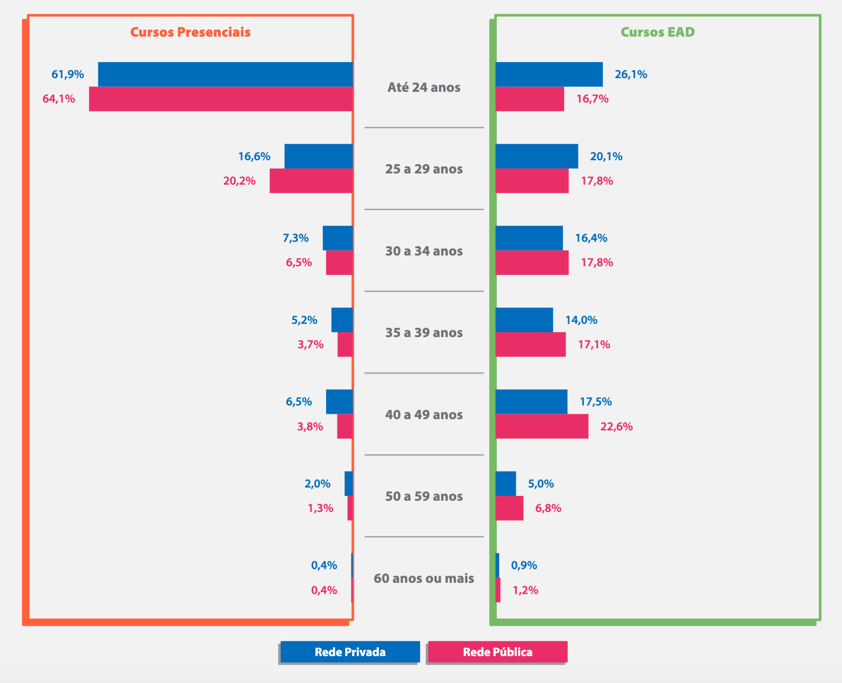 No presencial, o perfil é outro: 70,3% dos alunos têm até 24 anos — proporção que chega a 61,9% apenas na rede privada. A EaD, portanto, tem funcionado como principal porta de entrada para quem ingressa mais tarde ou retorna aos estudos.