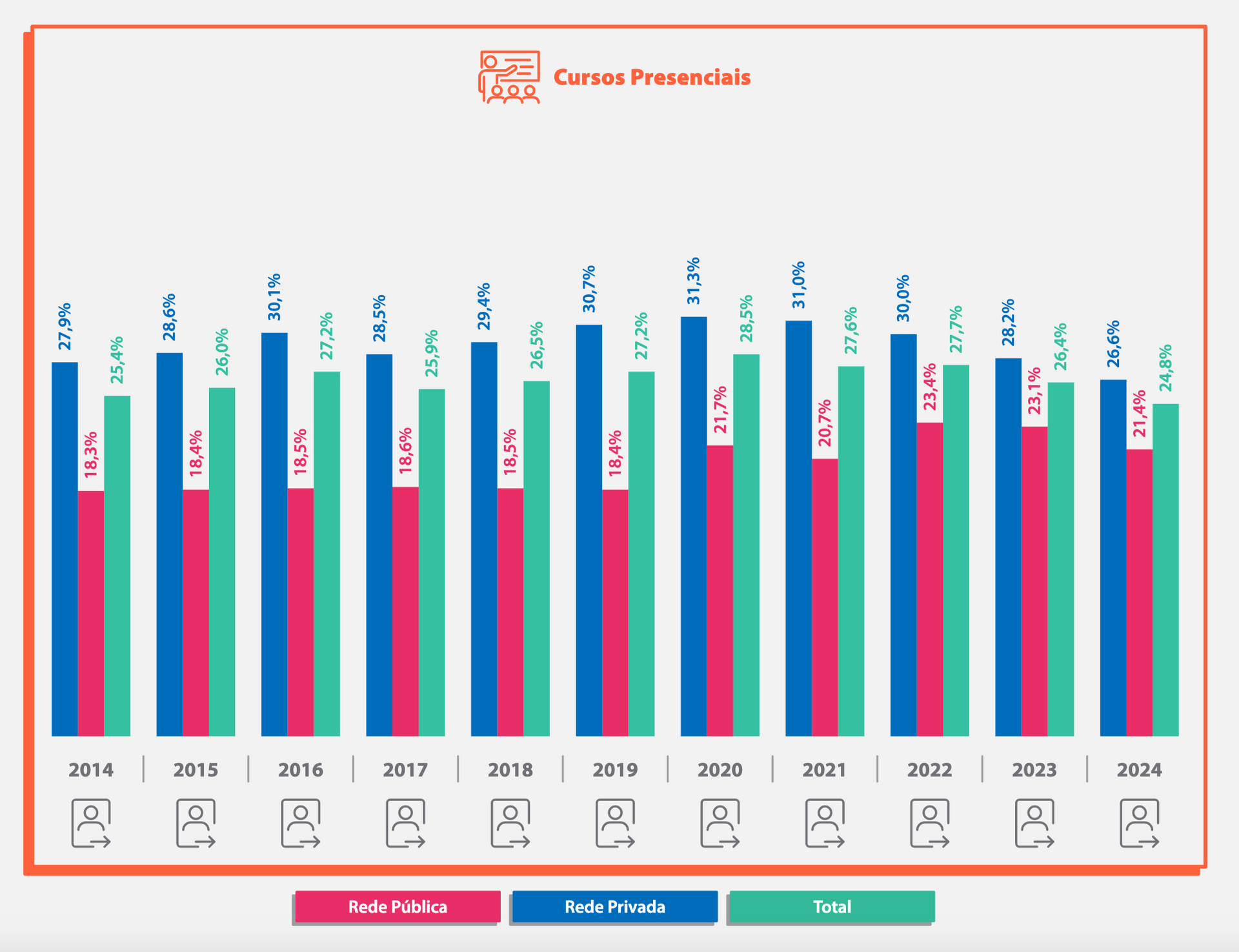 Em 2024, a taxa de evasão nos cursos presenciais foi de 24,8%, com a rede privada registrando 26,6%, acima da pública (21,4%). Embora tenha havido leve queda em relação a 2023 (28,2%), o índice aponta um desafio persistente para as instituições privadas.