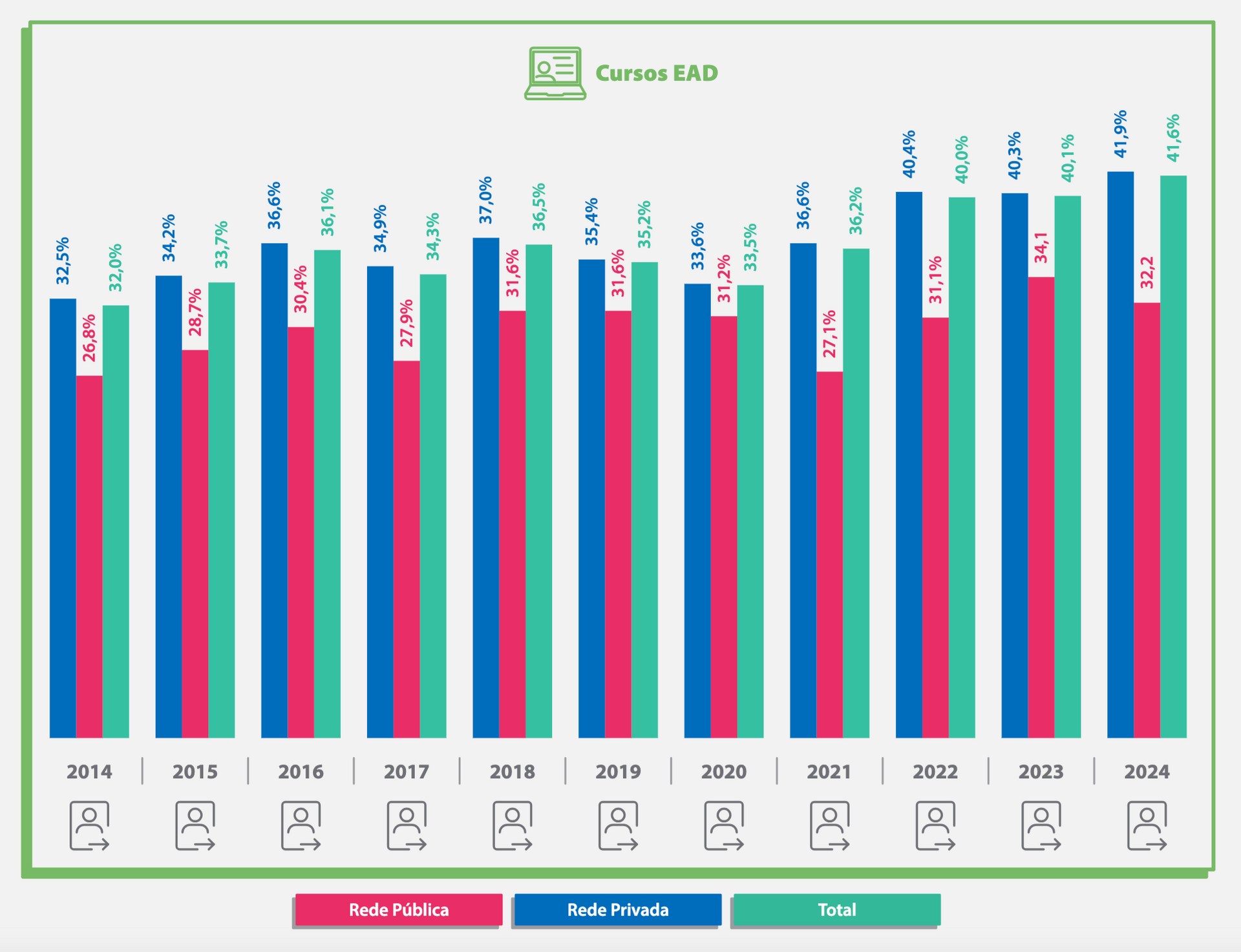 Na educação a distância, os índices são ainda mais altos. Em 2024, a evasão total chegou a 41,6%, com a rede privada alcançando 41,9%, frente a 32,2% na pública. Trata-se do maior patamar da série histórica no setor privado, evidenciando uma velha dificuldade das IES.