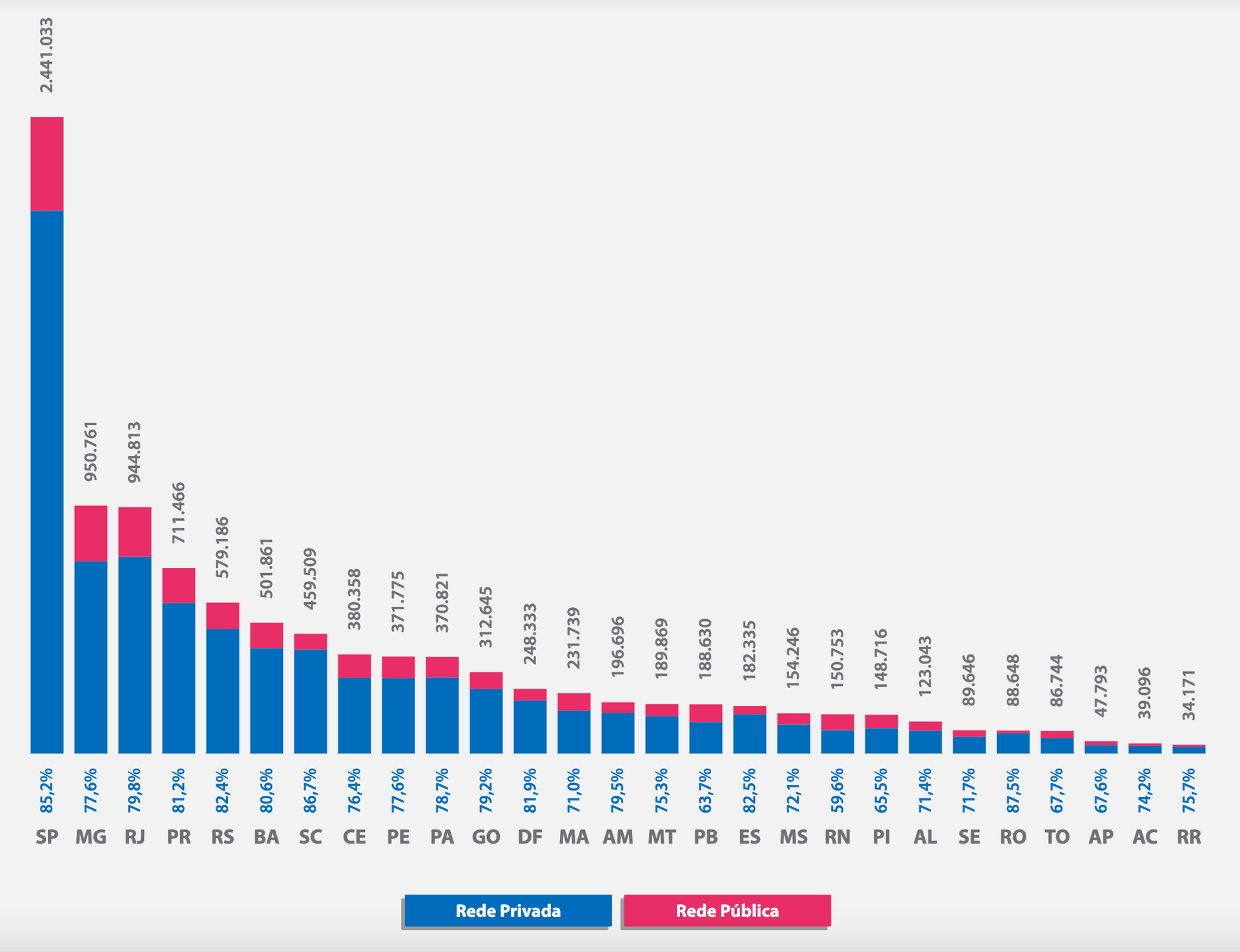 *O Mapa o Ensino Superior no Brasil utiliza a seguinte base de dados: Censo da Educação Superior, de 2014 a 2024; Censo da Educação Básica, de 2015 a 2020; Pesquisa Nacional por Amostra de Domicílios Contínua (Pnad Contínua), de 2021 a 2025; microdados do Exame Nacional do Ensino Médio (Enem), de 2015 a 2025; Exame Nacional de Desempenho dos Estudantes (Enade), de 2021 a 2023; Pesquisa de Mensalidades Aplicadas do Instituto Semesp, de 2025; análises de Big Data.