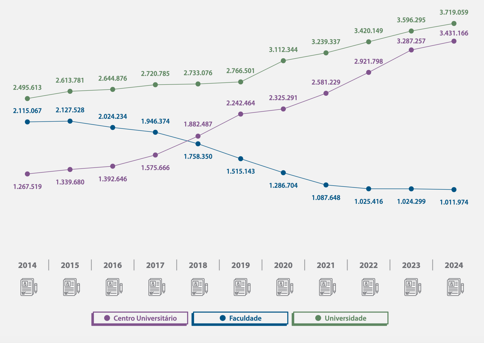 Entre 2014 e 2024, os centros universitários cresceram 201%, enquanto o número de faculdades recuou 5,7%. No mesmo período, o total de instituições privadas avançou 8,4% e o número de universidades, 7,1%.