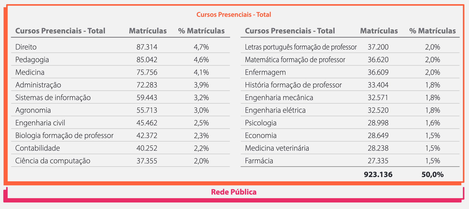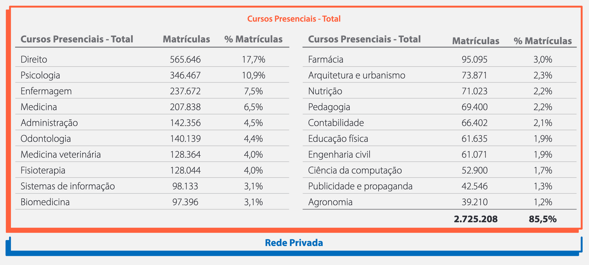 O levantamento traz também rankings com os cursos mais procurados. E o que se percebe é que a distribuição das matrículas no ensino superior brasileiro segue altamente concentrada em poucas áreas de formação.