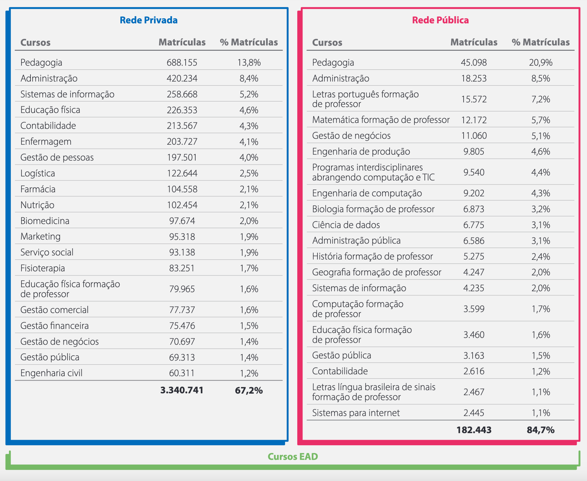 Um ponto destacado no capítulo especial é o uso intensivo da EaD pelo setor privado, especialmente universidades e centros universitários, reforçando seu papel no atual modelo de crescimento. A combinação entre autonomia institucional e oferta escalável ajuda a explicar a concentração de matrículas nesses formatos — e a consequente perda de espaço das faculdades.