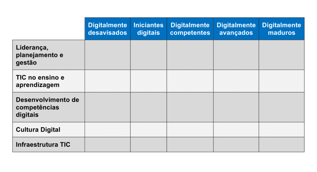 São cinco áreas e cinco níveis da maturidade digital das escolas que são avaliados: