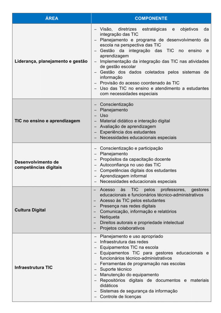 Áreas e componentes da maturidade digital das escolas. Crédito: reprodução.