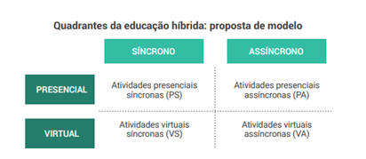 Nesse cenário, a Associação Brasileira de Mantenedoras de Ensino Superior (ABMES) elaborou o conceito de quadrantes híbridos. O objetivo era reunir em um modelo único as diversas possibilidades abertas pelo ensino híbrido, levando em conta as atividades presenciais e virtuais e síncronas e assíncronas.
