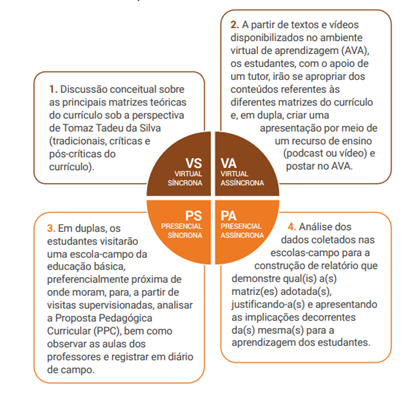 No exemplo, a jornada de aprendizagem do aluno passa por todos os quadrantes híbridos. Nos quadrantes virtuais, acontece a apropriação e discussão teórica do conteúdo. Já os momentos presenciais são reservados à prática.